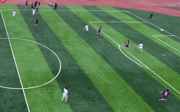 下午3點,比賽開始,兩隊迅速進入狀態(tài),隊員們盡情揮灑汗水,享受著比賽的激情??焖賯髑?,奮力拼搶,你來我往攻守頻換,每一次搶斷、射門都會引來全場歡呼。