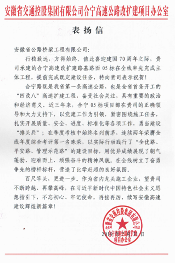 近日,合寧05標項目部收到項目辦發(fā)來的表揚信,對項目全線率先完成主體工程建設(shè)任務(wù)表示祝賀,對項目團隊管理水平、工程形象進度等工作給予了表揚。