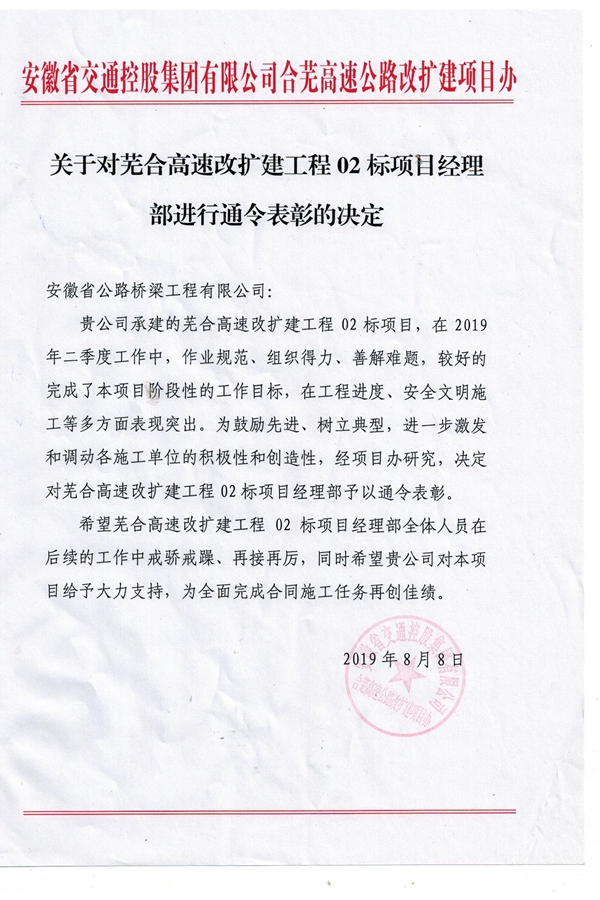 近日,合蕪02標(biāo)收到來自項(xiàng)目辦簽發(fā)的通令表彰文件,對(duì)項(xiàng)目在二季度較好完成階段性工作目標(biāo)給予肯定,對(duì)項(xiàng)目工程進(jìn)度、安全文明施工等方面取得的突出成績(jī)表示贊揚(yáng)。