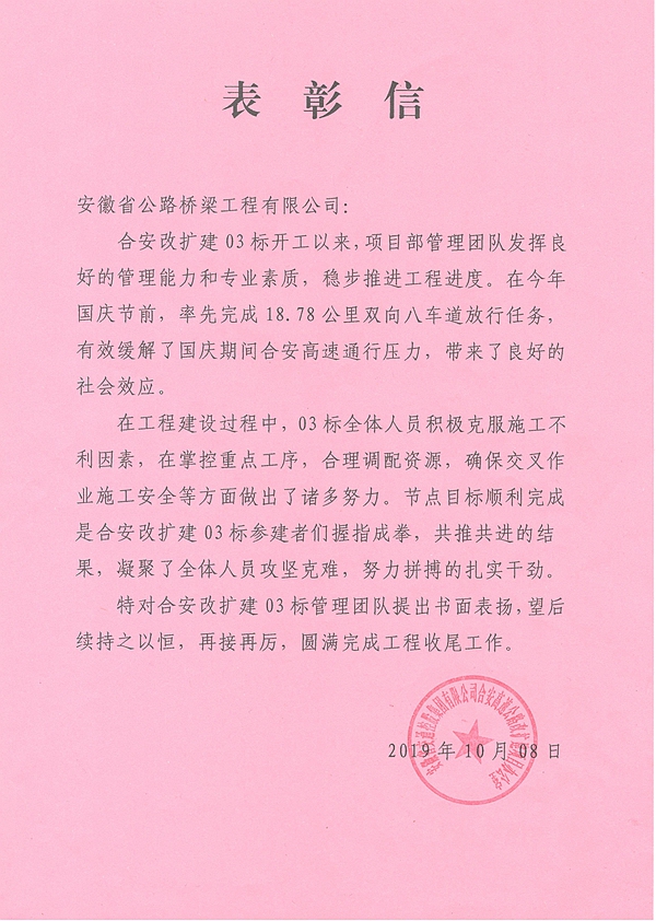 近日,合安高速改擴(kuò)建項(xiàng)目辦發(fā)來表彰信,對公司承建的第三標(biāo)段給予書面表揚(yáng)。