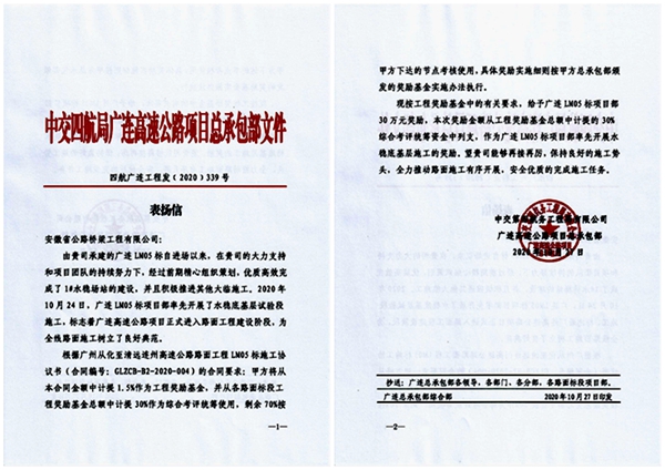 近日,中交四航局廣連高速公路項目總承包部發(fā)來表揚信,對公司承建的廣連高速05標(biāo)優(yōu)質(zhì)高效完成1#水穩(wěn)場站建設(shè)和率先啟動水穩(wěn)底基層試驗段施工給予表彰。