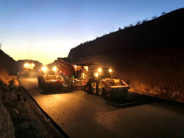 項目全長34.6公里,途徑四個鄉(xiāng)鎮(zhèn),在完成路基施工后,根據(jù)交驗時間分段進入路面攤鋪。立足實際情況,項目充分發(fā)揮主觀能動性,尋找一切可利用的工作面,精心策劃、見縫插針組織路面施工。在率先完成一工區(qū)水穩(wěn)、瀝青攤鋪施工任務后,迅速組織精干力量,轉(zhuǎn)戰(zhàn)一二工區(qū)連接部分攤鋪施工,僅用20余天打通了兩個工區(qū)的運輸通道。