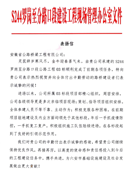 近日,六安市S244羅崗至分路口段建設(shè)工程現(xiàn)場辦發(fā)來表揚(yáng)信,對公司承建的03標(biāo)項(xiàng)目順利完成前期各項(xiàng)任務(wù)給予高度認(rèn)可并通報(bào)表揚(yáng)。