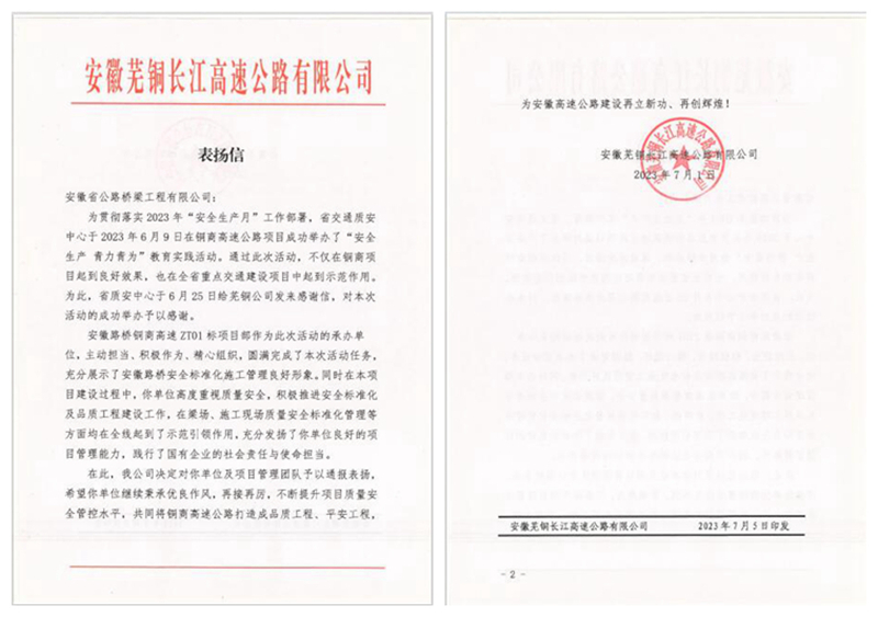 來信指出,公司承建的銅商高速無巢段ZT01標項目主動擔當、積極作為、精心組織,圓滿完成安徽省交通質安中心“安全生產 青力青為”教育實踐活動的承辦工作任務。同時在項目建設過程中,公司和項目管理團隊高度重視質量安全,積極推進安全標準化及品質工程建設工作,在梁場、施工現(xiàn)場質量安全標準化管理等方面均在全線起到了示范引領作用,充分展現(xiàn)了良好的項目管理能力,踐行了國有企業(yè)的社會責任與使命擔當。