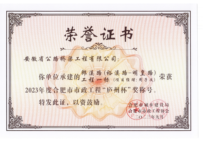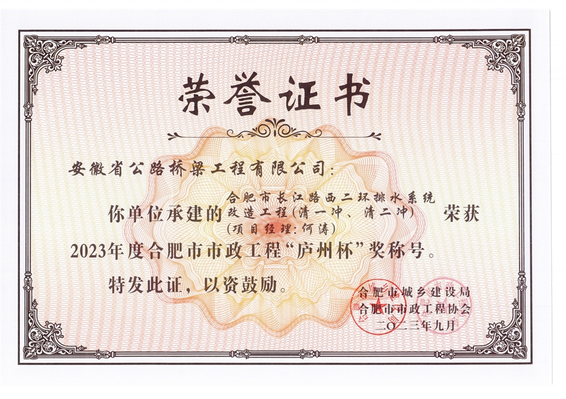 日前,由公司承建的郎溪路(裕溪路-明皇路)工程一標(biāo)、暢通二環(huán)北環(huán)(淮南路節(jié)點(diǎn))工程、合肥市長(zhǎng)江路西二環(huán)排水系統(tǒng)改造工程(清一沖、清二沖)三個(gè)市政項(xiàng)目榮獲2023年度合肥市市政工程“廬州杯”獎(jiǎng)。