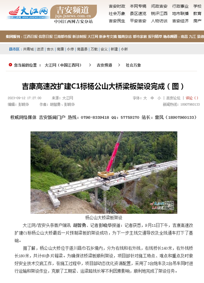 【名媒聚焦】大江網(wǎng):安徽路橋吉康改擴建C1標楊公山大橋梁板架設(shè)完成