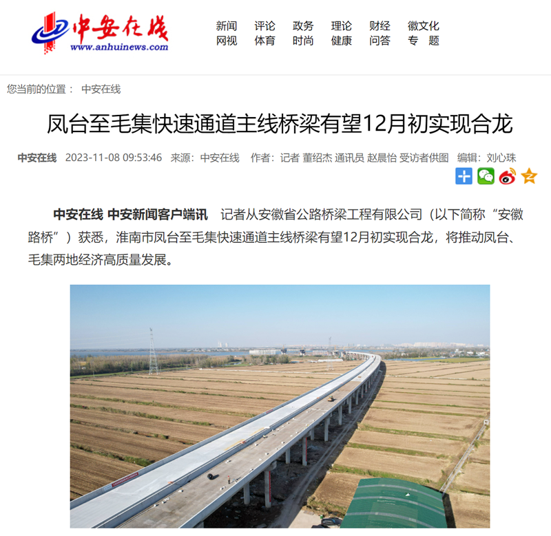 【名媒聚焦】中安在線:鳳臺至毛集快速通道主線橋梁有望12月初實現(xiàn)合龍