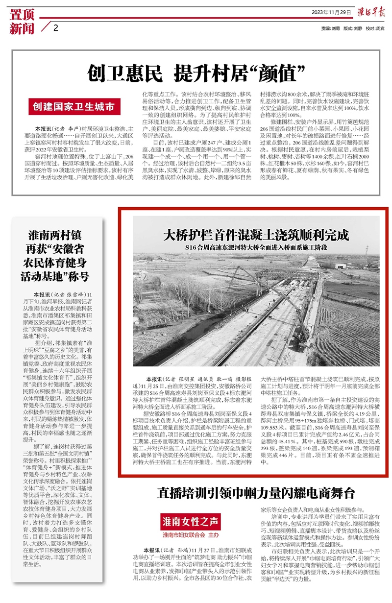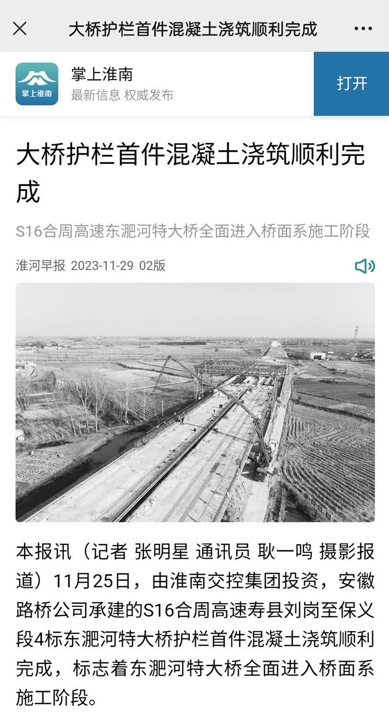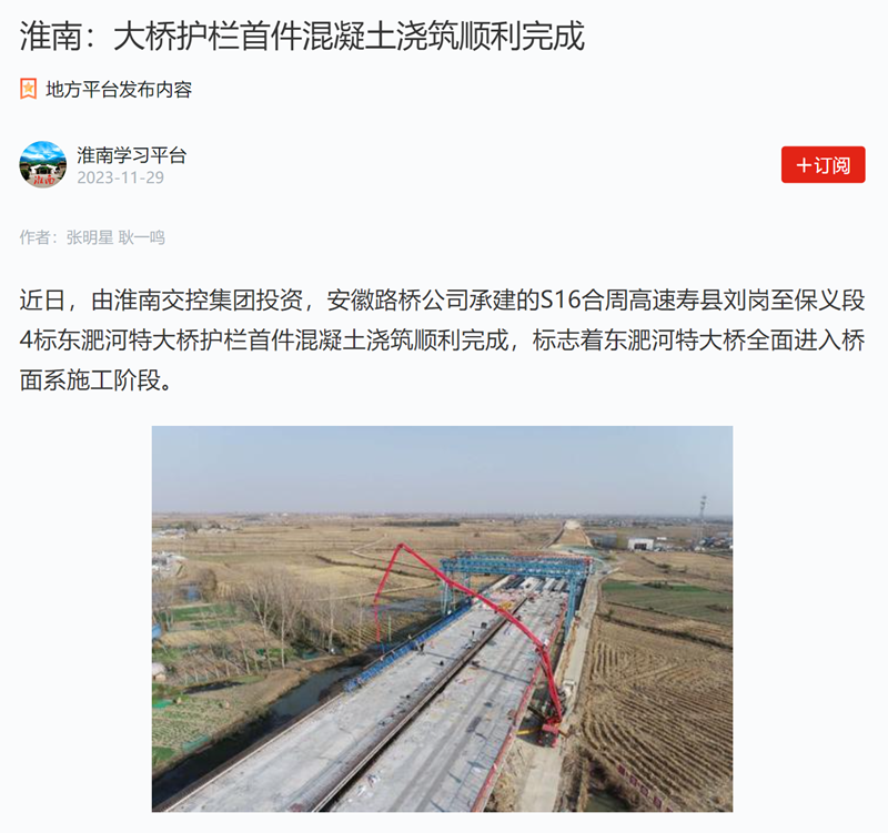 【名媒聚焦】學(xué)習(xí)強(qiáng)國(guó)、淮河早報(bào)、掌上淮南:S16合周高速東淝河特大橋全面進(jìn)入橋面系施工階段