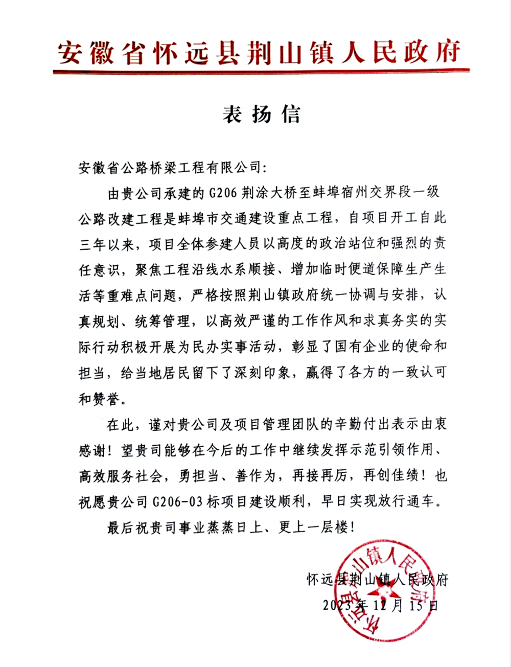懷遠縣荊山鎮(zhèn)人民政府來信表示,G206荊涂大橋蚌埠至宿州交界段一級公路改建工程03標(biāo)項目全體參建人員積極與政府協(xié)調(diào)配合,推動項目高質(zhì)量建設(shè),以實際行動積極開展為群眾辦實事活動,踐行了國企擔(dān)當(dāng)。
