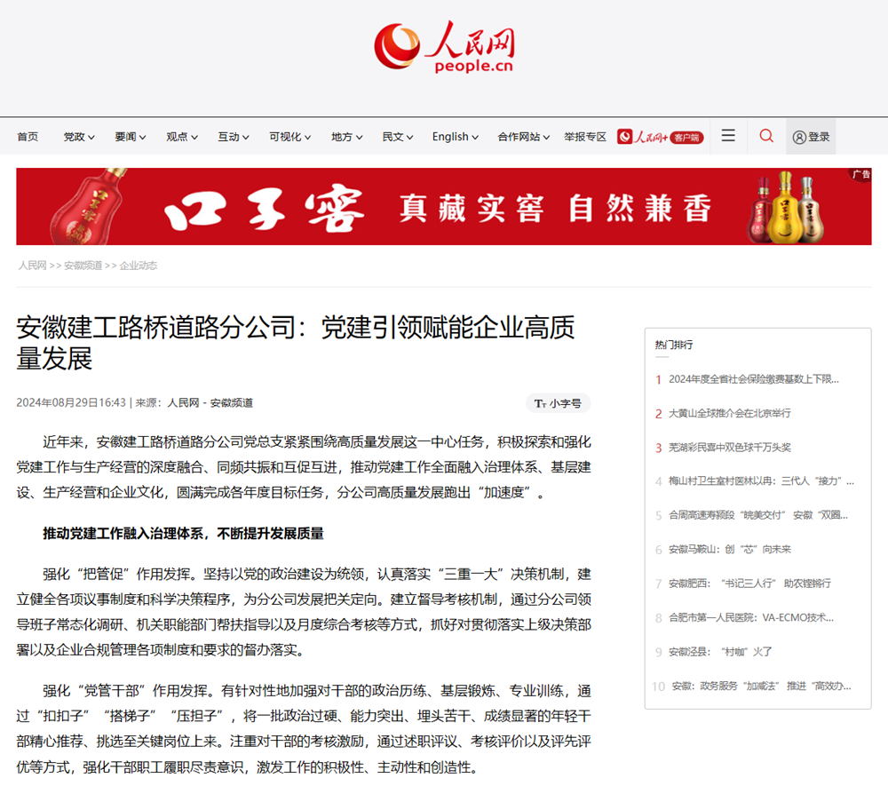 【名媒聚焦】人民網(wǎng)——安徽建工路橋道路分公司:黨建引領(lǐng)賦能企業(yè)高質(zhì)量發(fā)展