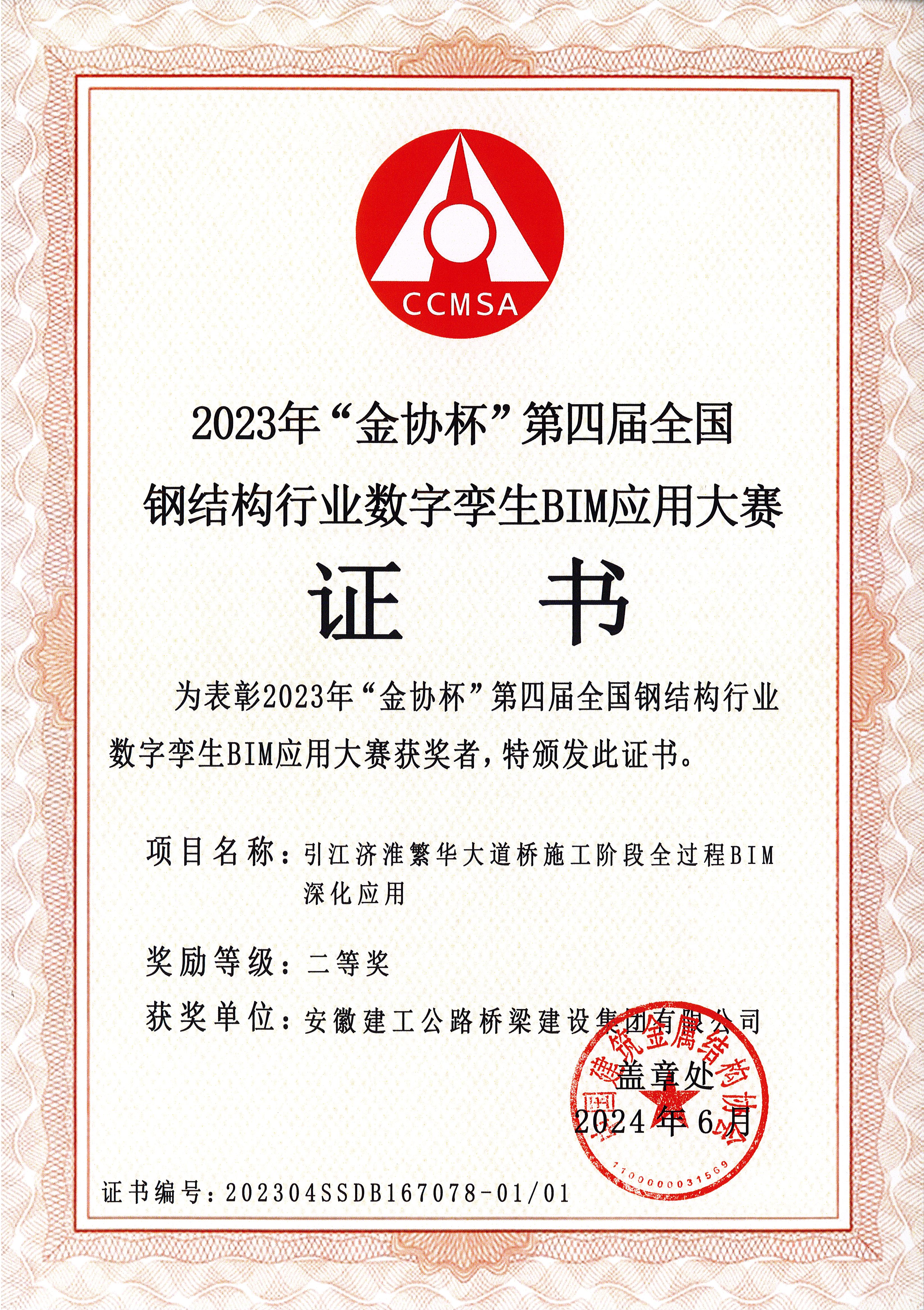 近日,2024年全國建筑鋼結(jié)構(gòu)行業(yè)數(shù)字孿生高峰論壇暨“金協(xié)杯”第四屆BIM應(yīng)用大賽表彰大會在鄭州隆重召開。公司選送的“引江濟(jì)淮繁華大道橋施工階段全過程BIM深化應(yīng)用”成果獲得二等獎。