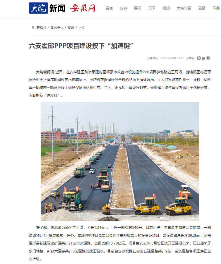 【名媒聚焦】央廣網(wǎng)、安徽日?qǐng)?bào):安徽建工路橋霍邱PPP項(xiàng)目建設(shè)按下“加速鍵”