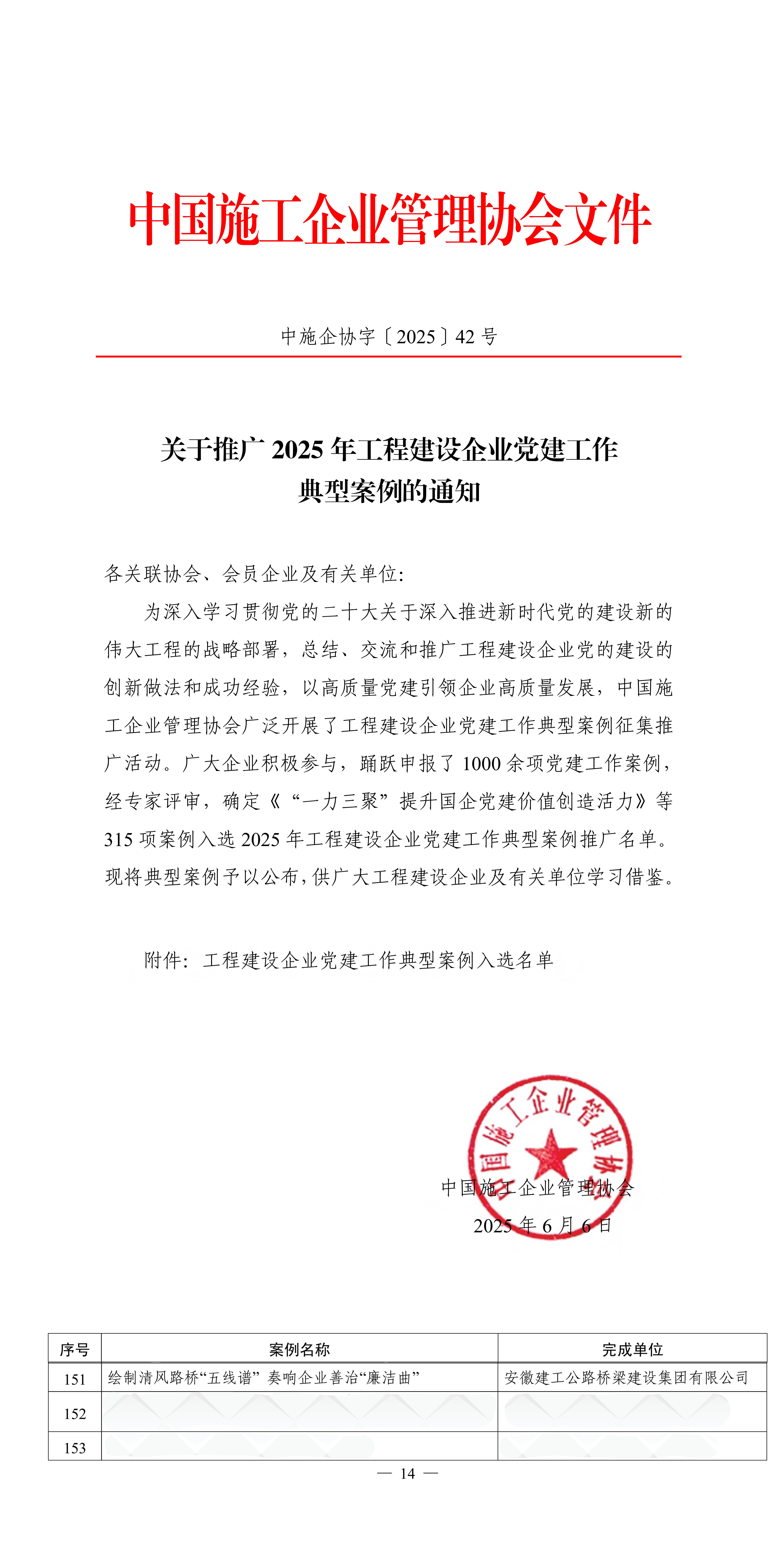 近日,中國施工企業(yè)管理協(xié)會公布了2025年工程建設企業(yè)黨建工作典型案例評選結果,公司“繪制清風路橋‘五線譜’ 奏響企業(yè)善治‘廉潔曲’”廉潔文化案例從全國1000余項申報案例中脫穎而出,成功獲評。