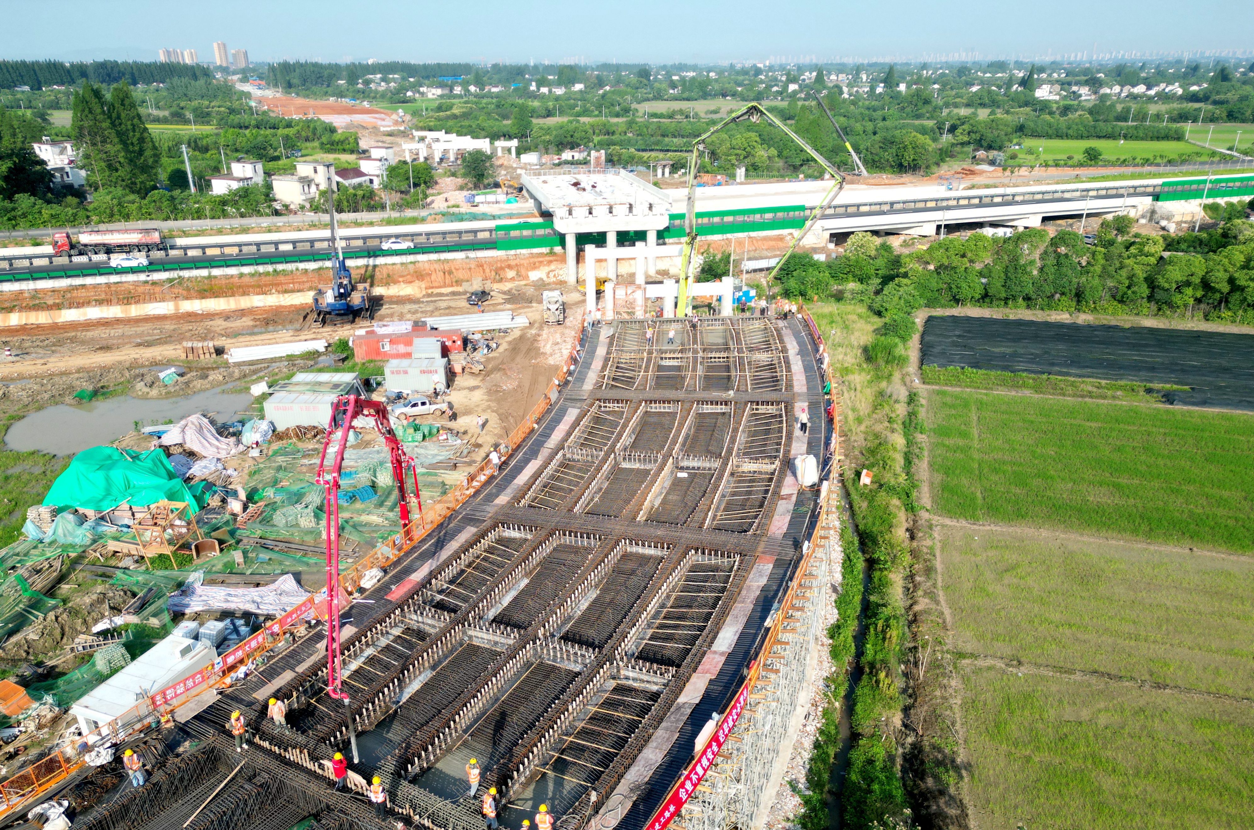 面對梅雨季節(jié)導(dǎo)致的施工便道通行不暢與地方協(xié)調(diào)壓力,項目部超前謀劃,完善施工方案,在交叉路口布置安全防護并全程值守,同時在施工便道各個通行困難地點安排機械鋪設(shè)鋼板,保證罐車按時抵達澆筑點。澆筑過程中嚴格把控現(xiàn)場工序質(zhì)量,加強現(xiàn)場盯控管理,為首件現(xiàn)澆箱梁的成功澆筑提供堅實保障。