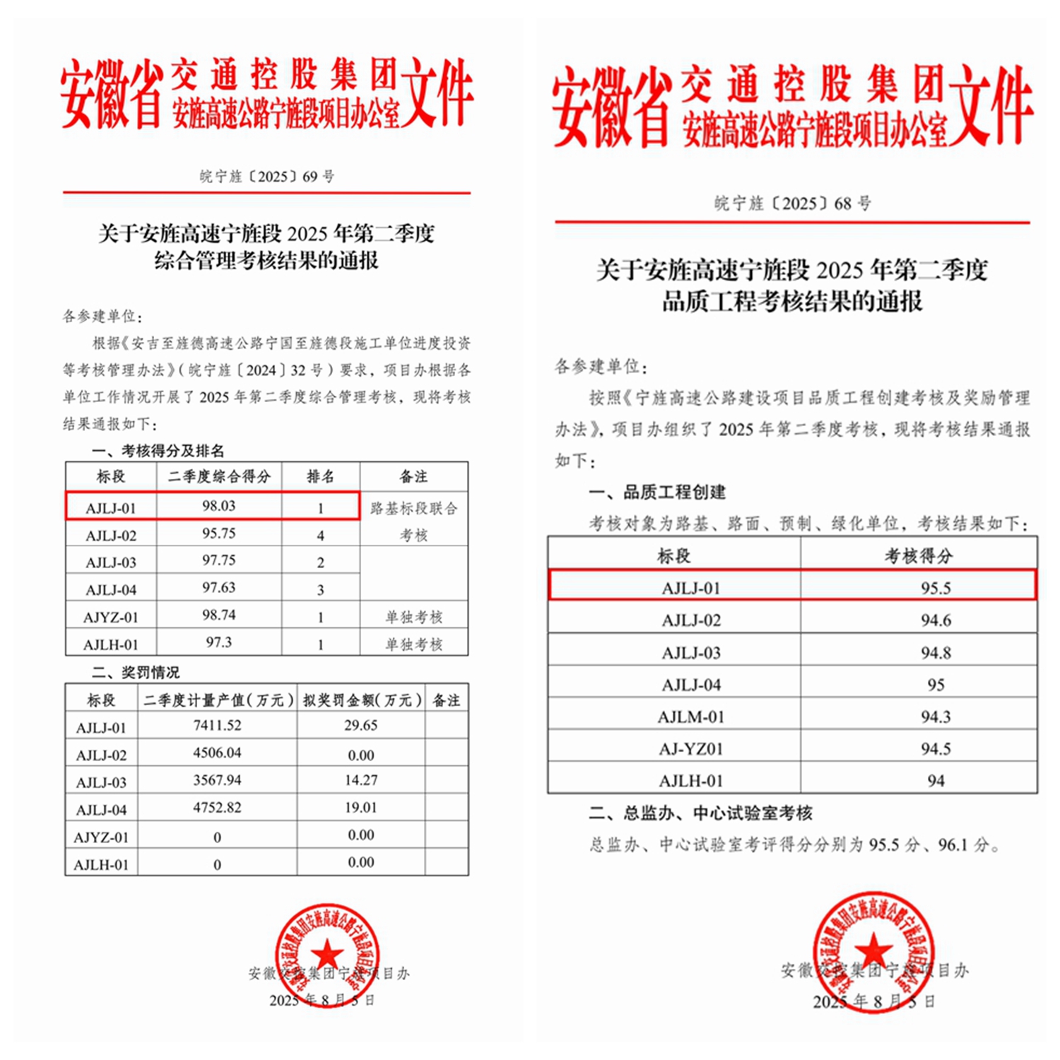 近日,安旌高速寧旌段辦公室公布了2025年第二季度綜合管理考核及品質(zhì)工程創(chuàng)建考核結(jié)果,公司承建的寧旌高速路基1標(biāo)在兩項(xiàng)考核中均獲得施工單位“第一名”。