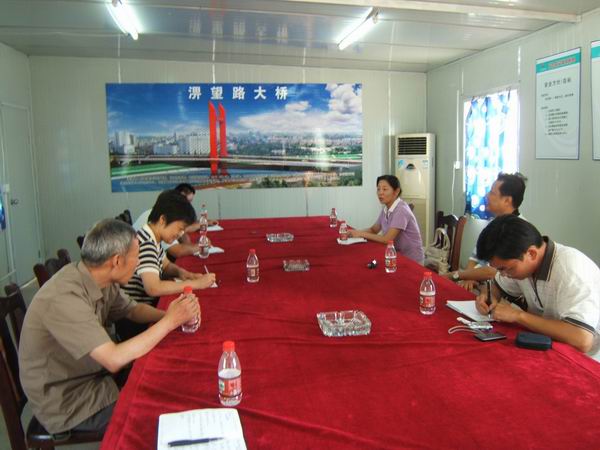 在項目部會議室,李主席等領(lǐng)導(dǎo)仔細(xì)聽取項目經(jīng)理江仲明的介紹,不時關(guān)切地詢問工程相關(guān)情況。工會主席趙其榮向集團(tuán)工會李主席等一行在高溫天氣下來公司淠望路大橋項目部慰問表示感謝。