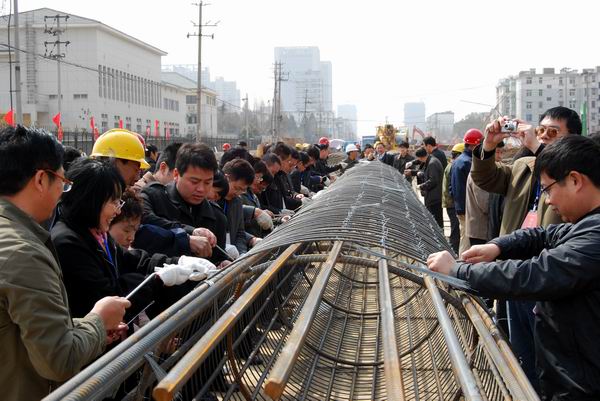 項(xiàng)目辦負(fù)責(zé)人向?qū)W員們簡(jiǎn)單介紹了工程概況。學(xué)員們?cè)诠と藥煾档闹笇?dǎo)下,紛紛戴上手套、拿起工具,給已成型的樁基鋼筋籠綁扎鋼絲,親身體驗(yàn)了建設(shè)者的辛勞。學(xué)員們虛心向工人師傅學(xué)習(xí),緊圍著鋼筋籠,一邊認(rèn)真扎絲,一邊相互交流,探討綁扎技巧。在學(xué)員們的巧手下,兩個(gè)鋼筋籠很快完成綁扎,將用于晚間施工。