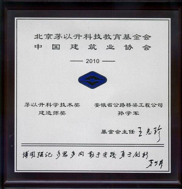 920,由中國(guó)工程院、重慶市政府、國(guó)家外國(guó)專(zhuān)家局和茅以升科技教育基金會(huì)聯(lián)合主辦的“國(guó)際橋梁與隧道工程技術(shù)高峰論壇暨茅以升先生誕辰115周年紀(jì)念大會(huì)”在重慶開(kāi)幕,大會(huì)對(duì)第20屆茅以升科學(xué)技術(shù)獎(jiǎng)獲獎(jiǎng)人員進(jìn)行了頒獎(jiǎng)授牌。公司副總經(jīng)理、正高級(jí)工程師孫學(xué)軍同志榮獲茅以升科學(xué)技術(shù)獎(jiǎng)——建造師獎(jiǎng)。