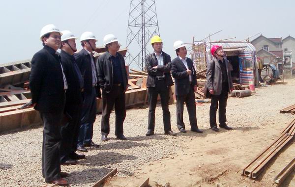 46上午,安徽建工集團(tuán)副總經(jīng)理、總工程師戴良軍、總經(jīng)理助理郭道真等領(lǐng)導(dǎo)一行,在公司總經(jīng)理汪衛(wèi)東、副總經(jīng)理盛明宏等陪同下,蒞臨宣貍BT項(xiàng)目檢查指導(dǎo)工作。
