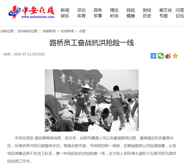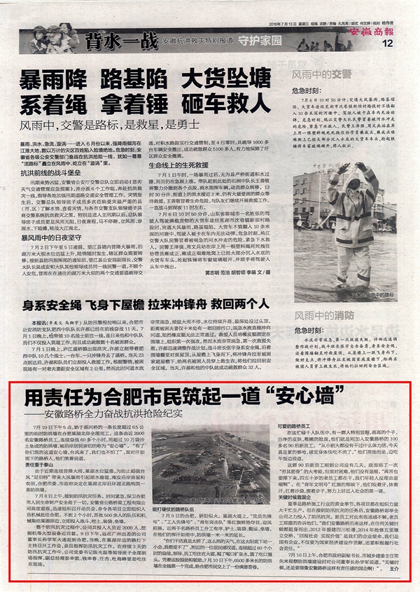 近日,公司積極響應(yīng)合肥市委、市政府號(hào)召,全力參與環(huán)湖大道和十五里河抗洪搶險(xiǎn)的事跡得到社會(huì)的高度關(guān)注。7月12日、13日,中安在線(xiàn)、《安徽商報(bào)》等多家省級(jí)媒體對(duì)公司抗洪搶險(xiǎn)事跡進(jìn)行了連續(xù)報(bào)道。