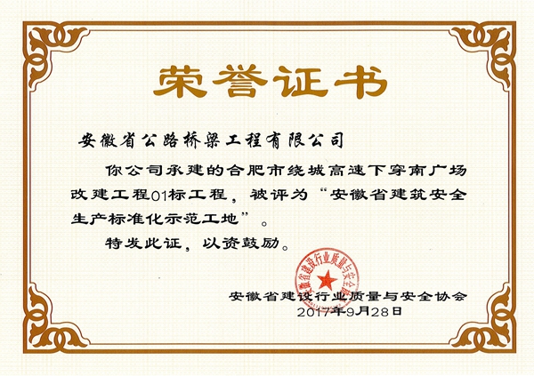 近日,從安徽省建設(shè)行業(yè)質(zhì)量與安全協(xié)會(huì)獲悉,由公司承建的合肥市繞城高速下穿南廣場(chǎng)改建工程01標(biāo)、合經(jīng)區(qū)習(xí)友路芙蓉路等道路改造工程兩個(gè)項(xiàng)目榮獲“安徽省建筑安全生產(chǎn)標(biāo)準(zhǔn)化示范工地”稱(chēng)號(hào)。
