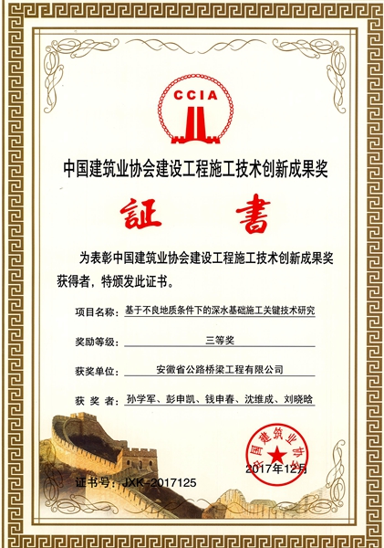 日前,中國建筑業(yè)協(xié)會(huì)公布了2017年建設(shè)工程施工技術(shù)創(chuàng)新成果獲獎(jiǎng)名單,公司組織申報(bào)的《基于不良地質(zhì)條件下的深水基礎(chǔ)施工關(guān)鍵技術(shù)研究》榮獲三等獎(jiǎng)。