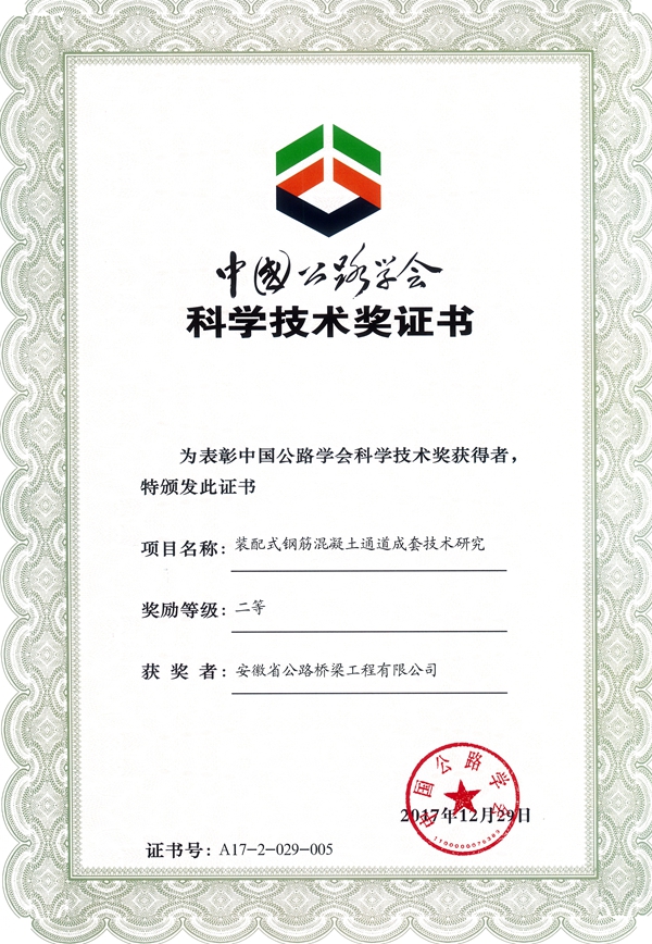 近期,“2017年度中國公路學(xué)會科學(xué)技術(shù)獎頒獎大會”在北京召開,公司選送的《裝配式鋼筋混凝土通道成套技術(shù)研究》成果榮獲二等獎。