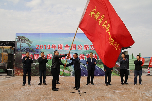 隨后舉行了授旗儀式,章后忠將一面“安徽省公路工程保障大隊”旗幟鄭重授予公司總經理錢申春。