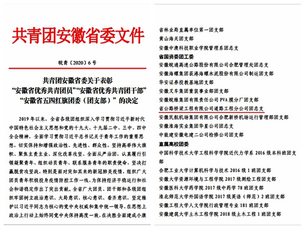道路分公司團(tuán)總支榮獲“安徽省五四紅旗團(tuán)總支”稱(chēng)號(hào)