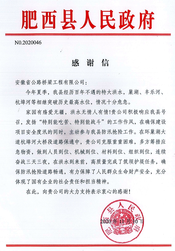 11月10日,肥西縣人民政府給公司送來(lái)一封感謝信,高度贊揚(yáng)公司在防汛搶險(xiǎn)工作中的突出貢獻(xiàn)和國(guó)企擔(dān)當(dāng)精神,并向公司致以衷心感謝。