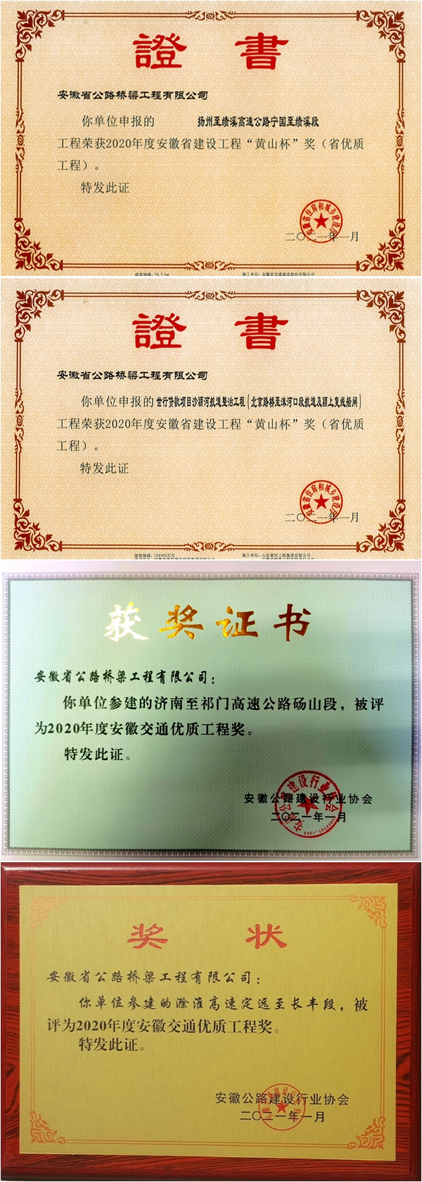 近日,2020年安徽省建設(shè)工程“黃山杯”和2020年度安徽交通優(yōu)質(zhì)工程獎(jiǎng)在合肥頒獎(jiǎng)。公司承建的揚(yáng)績高速公路寧國至績溪段路基07標(biāo)、沙潁河航道(北京路橋至沫河口段航道及潁上復(fù)線船閘)整治工程06標(biāo)榮獲2020年安徽省建設(shè)工程“黃山杯”。滁淮高速公路定遠(yuǎn)至長豐段路基05標(biāo)、路面02標(biāo),濟(jì)祁高速碭山段項(xiàng)目榮獲2020年度安徽交通優(yōu)質(zhì)工程獎(jiǎng)。