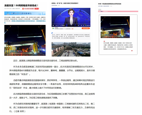 近日,人民網(wǎng)安徽頻道、合肥市廣播電視臺、合肥市人民政府等多家省市級主流媒體相繼報道了公司承建的郎溪路(裕溪路—明皇路)01標(biāo)項(xiàng)目建設(shè)情況。