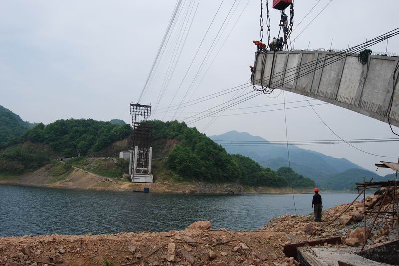 2009年4月30日上午10:30,寧?kù)o的大別山革命老區(qū)金寨縣梅山水庫(kù)上空傳來(lái)了清脆的鞭炮聲,絢爛的禮花把青山綠水映襯得更加多姿。備受社會(huì)關(guān)注的金寨縣金桃大橋主橋第二孔,即桃?guī)X跨第一片重達(dá)75T的箱拱梁被緩緩吊起,在眾目凝視下穩(wěn)穩(wěn)就位,為“五.一”國(guó)際勞動(dòng)節(jié)獻(xiàn)上了一份厚禮。這預(yù)示著金桃大橋又取得了一個(gè)實(shí)質(zhì)性的進(jìn)展和階段性的勝利。金寨縣交通局張傳旭局長(zhǎng)、王學(xué)軍副局長(zhǎng)、總監(jiān)賈淳忠等在公司總經(jīng)濟(jì)師楊文柱的陪同下,現(xiàn)場(chǎng)觀(guān)看了整個(gè)吊裝過(guò)程。下午,金寨縣人大副主任石本德、縣委常委、常務(wù)副縣長(zhǎng)趙權(quán)分別到場(chǎng)表示祝賀和慰問(wèn)。