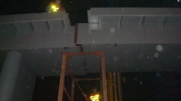 晚上21:30,運(yùn)梁車準(zhǔn)時(shí)將A梁運(yùn)達(dá)施工區(qū),隨即北一環(huán)南側(cè)在交警的協(xié)助下,按計(jì)劃全封閉。經(jīng)過(guò)近一個(gè)多小時(shí)的安裝,晚上23:00整,張洼路天橋施工區(qū)響起了一陣陣掌聲,禮炮隨后騰空燃起——A梁成功安裝了。B梁在隨后的3個(gè)小時(shí)內(nèi)也成功完成安裝。