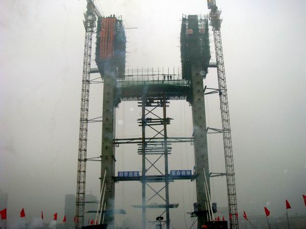 六安淠望路大橋全長(zhǎng)436.20,主橋?yàn)?st1:chmetcnv w:st="on" TCSC="0" NumberType="1" Negative="False" HasSpace="False" SourceValue="85" UnitName="米">85+120獨(dú)塔雙索面預(yù)應(yīng)力斜拉橋,是由兩個(gè)塔柱、一道橫梁組成。主塔高度66.123。每側(cè)塔柱分為11節(jié),采用翻模施工,每次施工高度為6.0米。淠望路大橋是我公司繼鳳臺(tái)淮河大橋以來(lái)承建的第二座大跨徑斜拉橋,也是我省第一座大跨徑非對(duì)稱(chēng)斜拉橋。