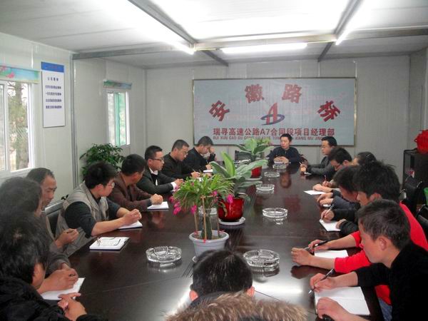 會上,劉大雷經(jīng)理向全體員工傳達了五屆二次會議的工作內(nèi)容要點,并帶領(lǐng)大家重點學(xué)習(xí)了公司總經(jīng)理汪衛(wèi)東關(guān)于《夯實管理基礎(chǔ),拓展發(fā)展空間,為推動安徽路橋快速發(fā)展而努力奮進》的工作報告。項目部成員結(jié)合A7標(biāo)施工實際,就汪總工作報告中闡述的2010年奮斗目標(biāo)和工作思路等內(nèi)容,進行了深入探討。瑞尋高速工程作為我公司進駐江西市場戰(zhàn)略中第一個中標(biāo)項目,A7標(biāo)的工作目標(biāo)不僅僅是完成這一具體工程,更深層次的是要打造品牌質(zhì)量,樹立起公司形象,進而開拓江西市場。在具體思路上,要以“和諧、奮進、創(chuàng)新、共贏”為宗旨,制定好周、月以及季度的施工計劃,強化項目管理,提高經(jīng)濟效益。同時,劉經(jīng)理提出工程的季度產(chǎn)值目標(biāo)和年度產(chǎn)值目標(biāo),希望各部門、各工區(qū)相互配合,共同完成每個階段的工程任務(wù)。