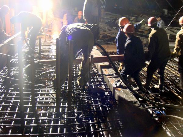 淠望路大橋主橋全長120米,共有15個節(jié)段,是整個大橋的重難點和關(guān)鍵控制性工程,全部采用前支點掛籃施工。由于施工技術(shù)含量高、施工難度大,關(guān)系到全橋的進(jìn)度與形象,是全橋施工的重中之重。開工伊始項目部就高度重視,提出了“向主橋要進(jìn)度、向引橋要形象”的口號;多次組織專家評審施工方案、優(yōu)化施工工藝,特別是“塔梁并進(jìn)”工藝的采用,極大地促進(jìn)了工效,既縮短了工期又降低了成本。隨著工程的推進(jìn),項目部審時度勢的不斷優(yōu)化整合施工資源配置:在施工力量、機(jī)械設(shè)備上優(yōu)先滿足主橋施工需要。在搶時間趕進(jìn)度的同時不斷強(qiáng)化現(xiàn)場安全生產(chǎn)管理,并嚴(yán)把質(zhì)量關(guān),特別是會同監(jiān)控單位加強(qiáng)了對整橋線形控制,使之符合設(shè)計和施工技術(shù)規(guī)范要求,達(dá)到了預(yù)期效果。在工序無間隙、晝夜無間斷,質(zhì)量有控制、安全有保障的良好狀態(tài)下,以七至八天每節(jié)段的速度全力推進(jìn)主橋建設(shè),圓滿的完成了主橋建設(shè)的各項任務(wù)。