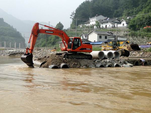 27日開始,天氣放晴,水位下降,我部抓住機會進行第三次搶修,一臺挖機、一臺裝載機和五臺運輸車同時作業(yè),終于在28日上午打通便橋。項目部迅速組織人員把施工設(shè)備、施工材料調(diào)運到對面,28日下午恢復(fù)小型結(jié)構(gòu)物施工。