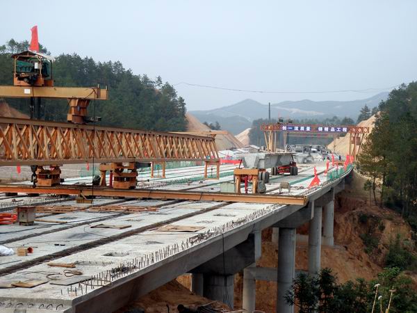 站塘高架橋位于會昌縣站塘鄉(xiāng),中心樁號問為K1498+450。大橋全長135米,共5跨,上部結(jié)構(gòu)為連續(xù)預(yù)應(yīng)力箱梁。10月5日,站塘大橋開始架設(shè)第一片箱梁,經(jīng)過一個(gè)多月的努力施工,終于全幅貫通。