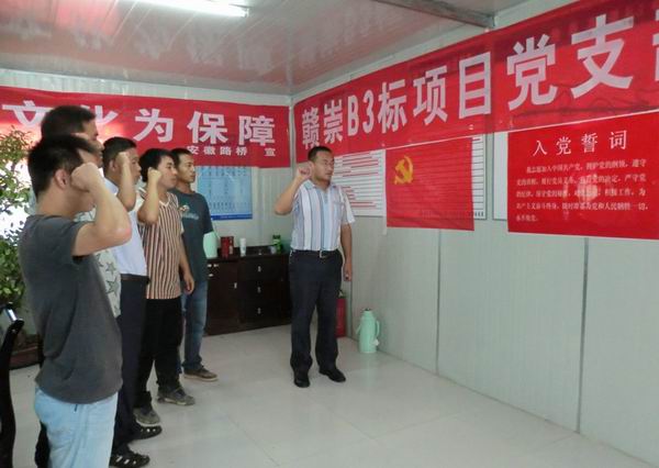 在中國(guó)共產(chǎn)黨成立90周年之際,贛崇高速B3標(biāo)項(xiàng)目部于710召開(kāi)黨支部會(huì)議,項(xiàng)目經(jīng)理張春濤、項(xiàng)目支部書(shū)記代聲慶等全體黨員以及入黨積極分子參加會(huì)議。