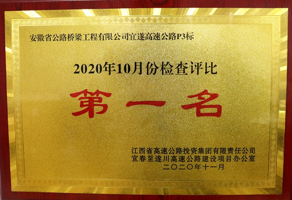 近日,江西省高速集團宜遂項目辦下發(fā)關(guān)于表彰十月份檢查評比先進單位的通報文件,公司承建的宜遂高速P3標在綜合檢查評比中表現(xiàn)優(yōu)秀,榮獲路面單位第一名。