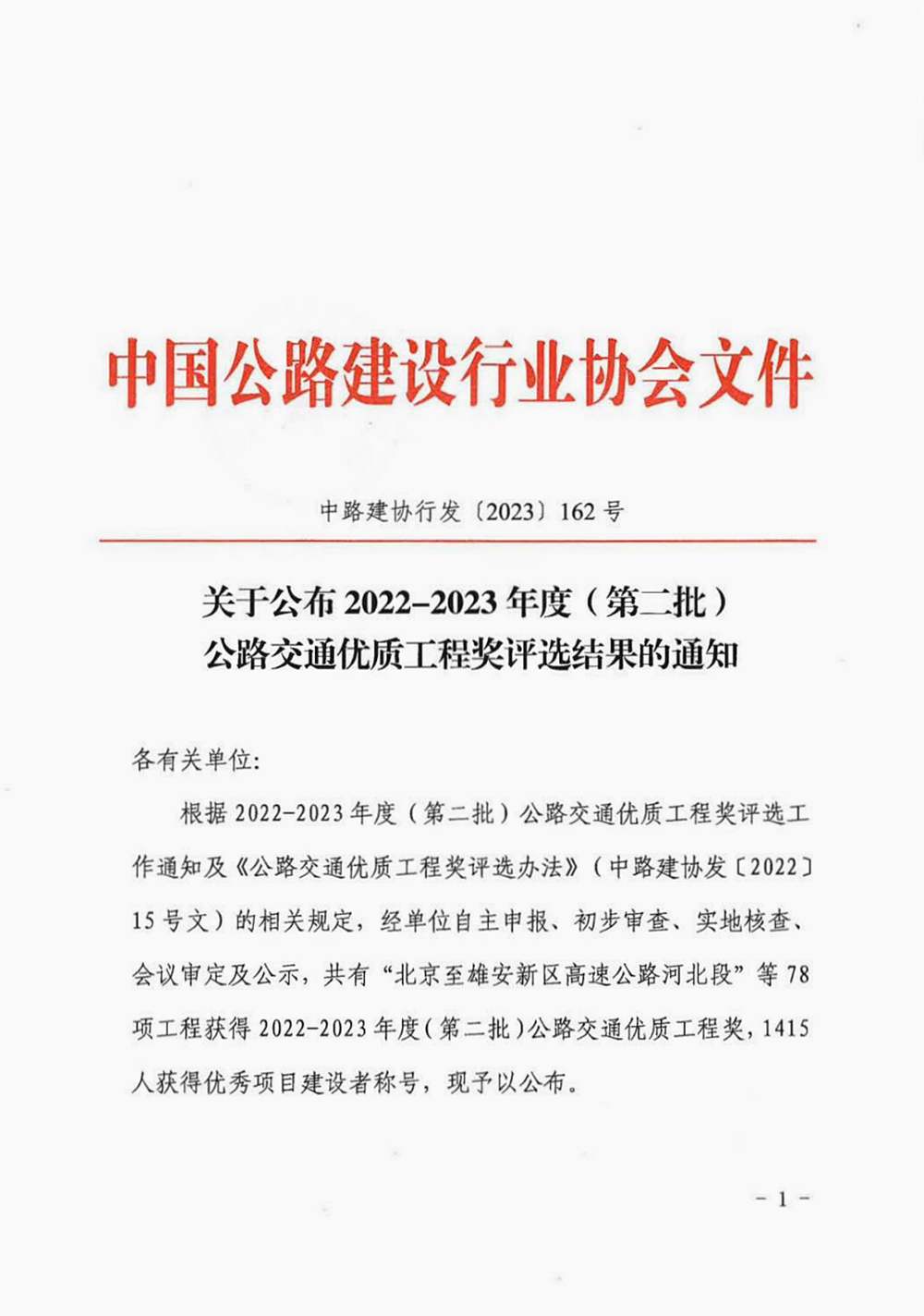 近日,中國公路建設行業(yè)協(xié)會公布2022~2023年度(第二批)公路交通優(yōu)質工程獎(李春獎)名單,公司參建的滁州至淮南高速公路定遠至長豐段、銅陵市G347普濟圩至樅陽段改建工程2個項目榜上有名。截至目前,公司已摘得12項“李春獎”。