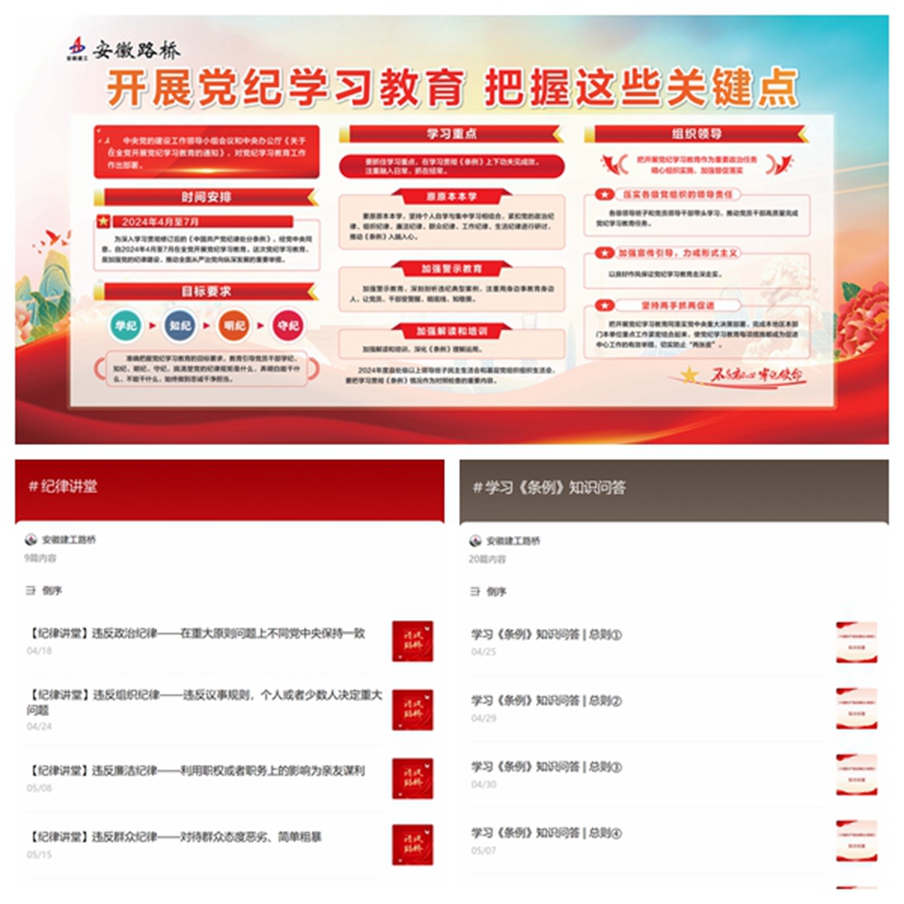 黨紀學習教育開展以來,公司黨委高度重視宣傳引導、氛圍提升。為擴大宣傳引導的接觸面,公司黨委統(tǒng)籌制定發(fā)布了黨紀學習教育展板。同時,立足“清風路橋”建設,加大宣傳力度,綜合運用官網(wǎng)、官微,設立“紀律講堂”“學習《條例》知識問答”等專欄,累計推出黨紀學習教育相關報道和學習材料80余篇次,做到“每日推送”。組織全體黨員職工參加公司內網(wǎng)《條例》線上知識測試,以考助學、以訓促學,鞏固學習成果,檢驗學習成效,在全公司營造學紀、知紀、明紀、守紀的良好氛圍。各級黨組織通過“三會一課”等方式開展專題學習230余次,受教育黨員、職工累計超2500人次。