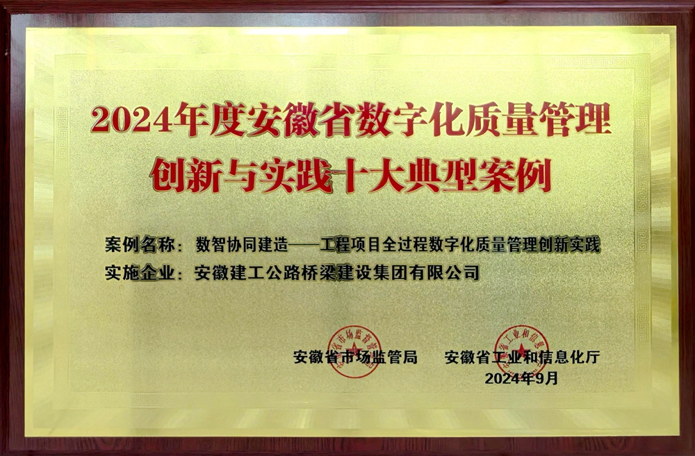 9月5日,安徽省2024年“質(zhì)量月”活動(dòng)啟動(dòng)儀式在合肥舉辦,安徽省人民政府副省長(zhǎng)李中、中國(guó)質(zhì)量報(bào)刊社總編輯劉忠學(xué)、安徽省市場(chǎng)監(jiān)督管理局有關(guān)負(fù)責(zé)同志參加儀式。啟動(dòng)儀式公布了2024年度安徽省數(shù)字化質(zhì)量管理創(chuàng)新與實(shí)踐十大典型案例,公司《數(shù)智協(xié)同建造》案例成功入選。