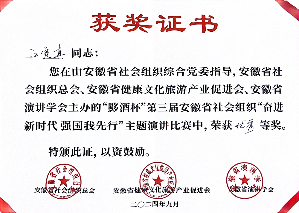 9月21日,第三屆安徽省社會組織“奮進(jìn)新時代 強國我先行”主題演講比賽復(fù)賽、決賽在合肥舉行,公司選送參賽選手江定真參加角逐,經(jīng)過激烈比拼,榮獲優(yōu)秀獎。